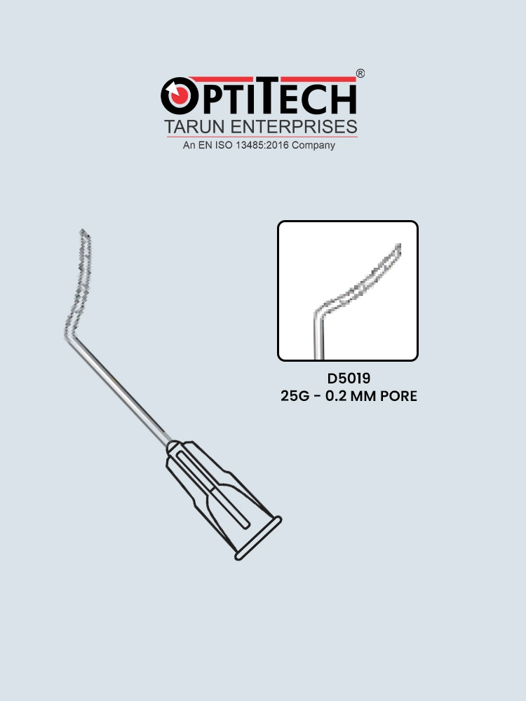 The Solomon Cannula is a fine, angled irrigation cannula used primarily during cataract and other ophthalmic procedures to maintain anterior chamber stability and irrigate tissues with control. Its pore allows accurate fluid flow, ensuring minimal disruption to ocular structures. The bent shaft design enhances maneuverability, making it ideal for use through side port incisions.